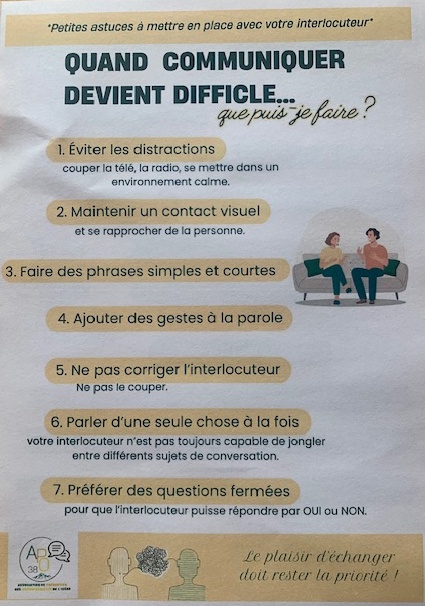 En ce qui concerne la communication non verbale : renforcer les expressions verbales, l’intonation , l’usage de mots-clefs, l’utilisation de gestes qui soutiennent l’information, le regard.. sont des éléments clefs qui vont encourager la compréhension  et la communication.
